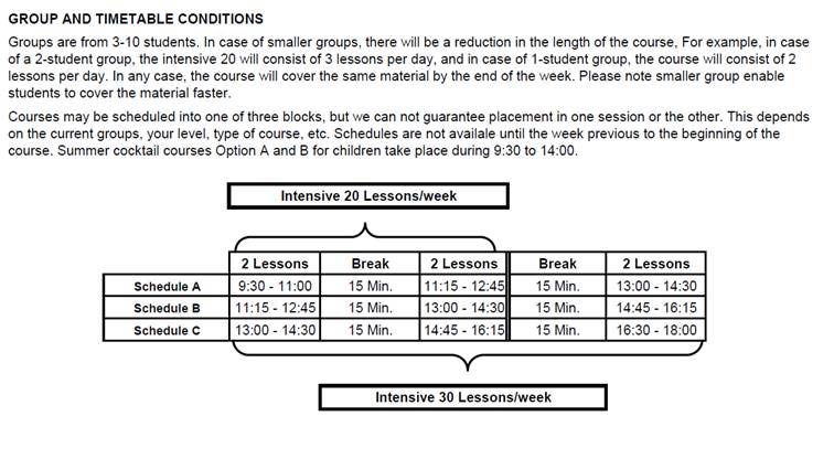 Bitte beachten Sie: Unterrichtszeiten können nicht garantiert werden. Die Sprachschule ist aber stets bemüht die Stundenpläne im Sinne der Teilnehmenden zu erstellen. Sollten Sie eine Unterrichtszeit bevorzugen, so teilen Sie dies bitte direkt bei der Buchung mit.